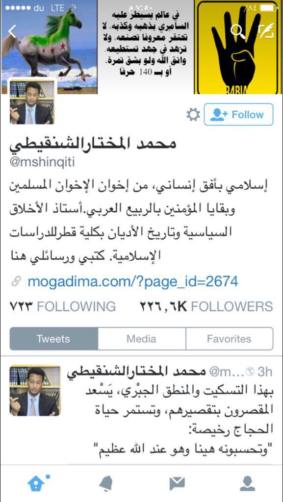 ((اخونجي حاقد ينفث سمومه على بلادنا وقيادتنا من قطر)) إخونجي ساقط وحاقد تفوح من فمه روائح الحقد على بلادنا وقيادتنا وشعبنا وتطير كلماته شرارات الزندقة وإشارات الكبر والتعالي والإعجاب بالنفس يعمل في كلية الدراسات الإسلامية في قطر وكعادة أمثاله لايدع فرصة للنيل من المملكة إلا استغلها للتنفيس عن حقده وحقد حزبه عليها وعلى حكمها وحكامها ونظامها وبعد حادث التدافع المؤلم في منى وجد فرصة للتنفيس عن أحقاده فنعق ببعض التغريدات الشامتة والفاجره هذا تعريفه بنفسه من حسابه: https://pbs.twimg.com/media/CPuDUmnU8AAmNch.jpg:large وهنا بعض تغريداته الحاقده عن حادث التدافع: https://pbs.twimg.com/media/CPuDUmeUEAAIiRT.jpg:large |